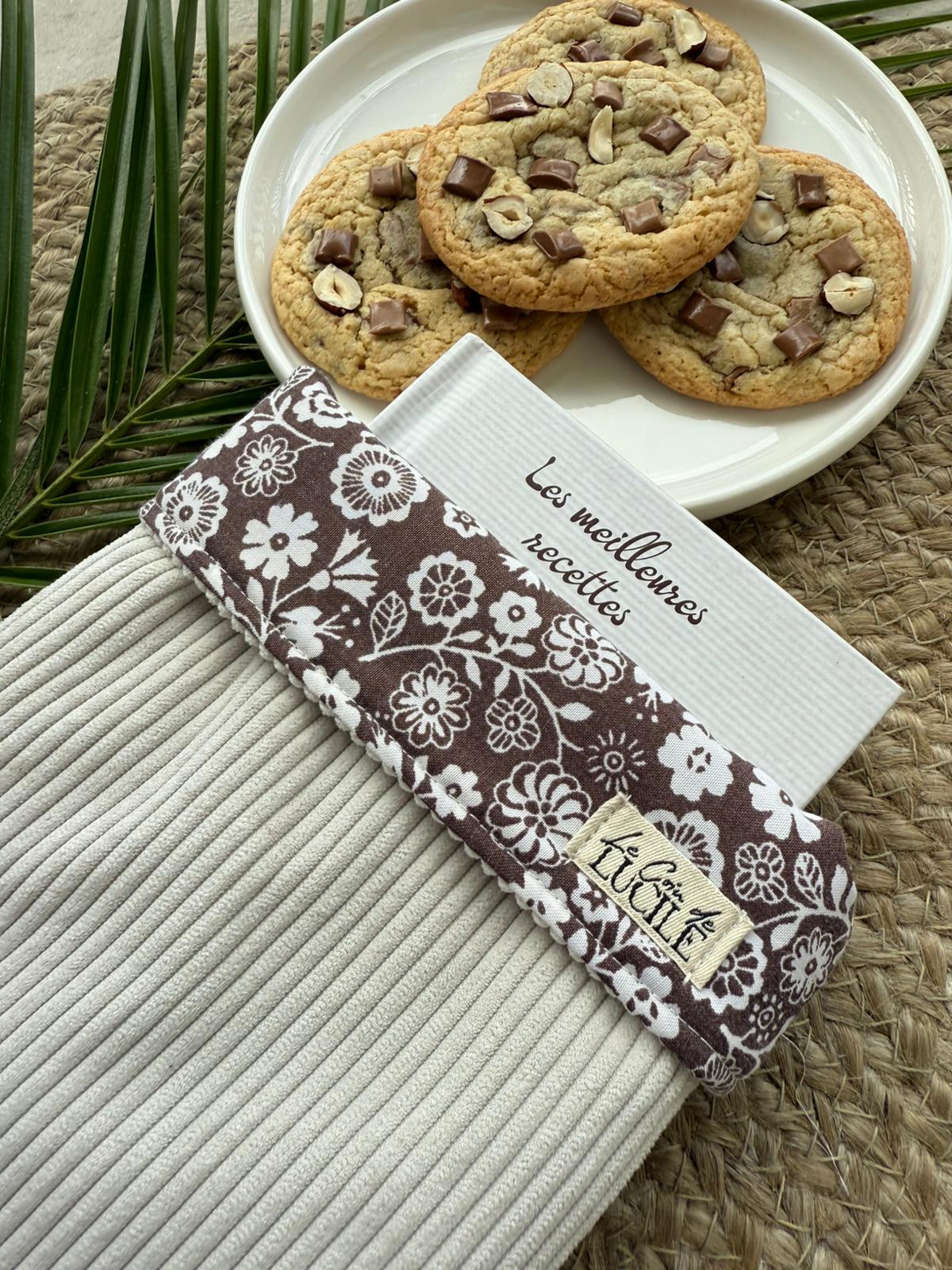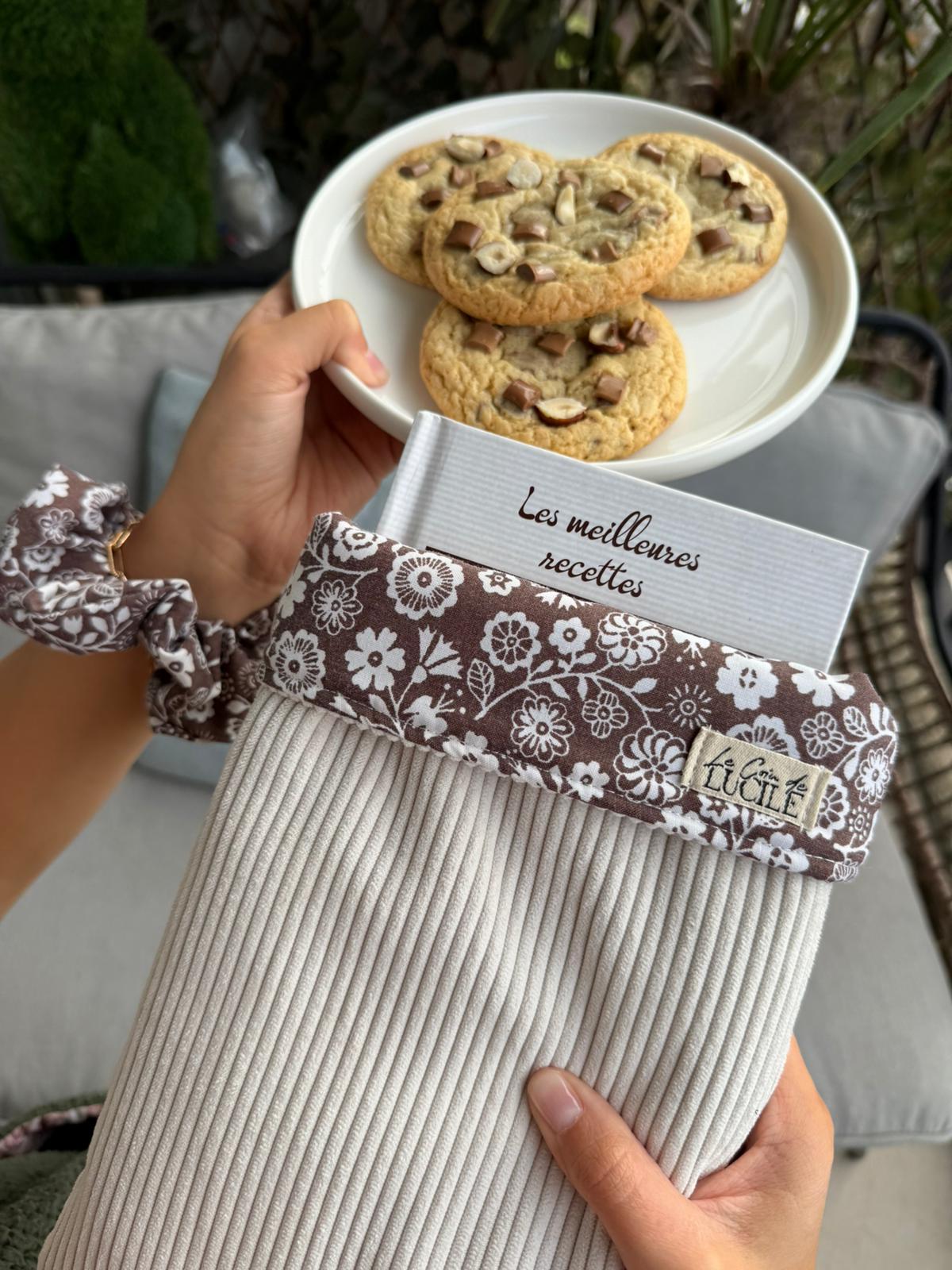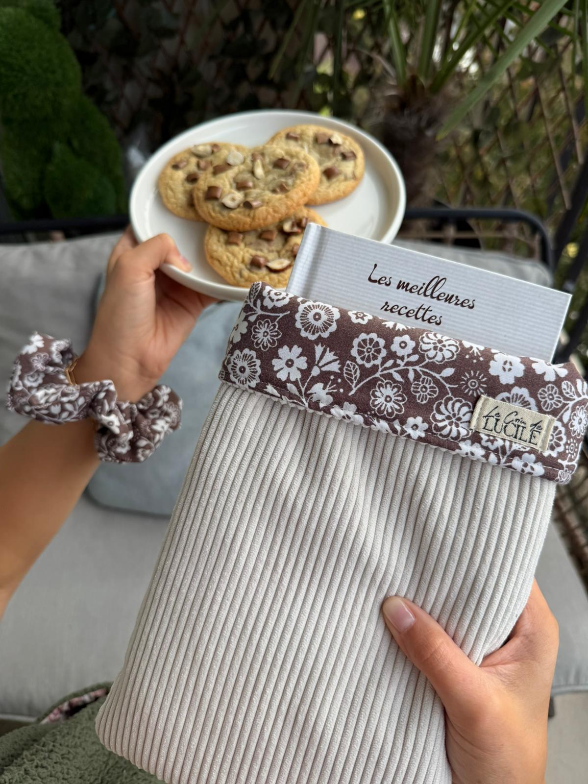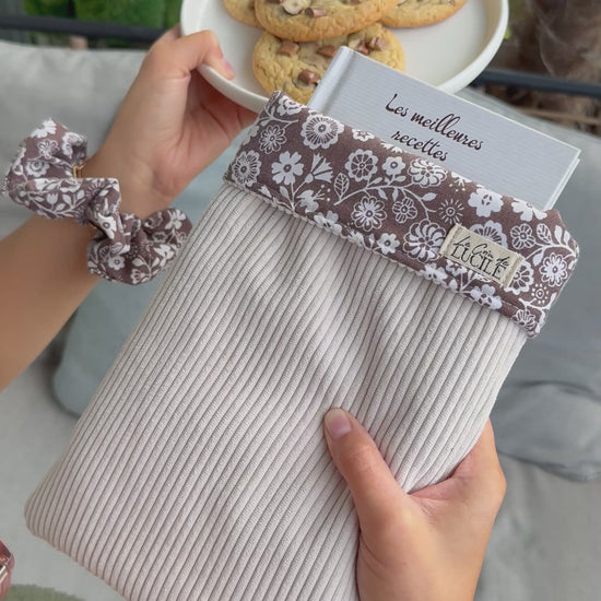Pochette pour livre de poche, broché, liseuse - Velours côtelé blanc cassé et coton fleuri marron upcycling